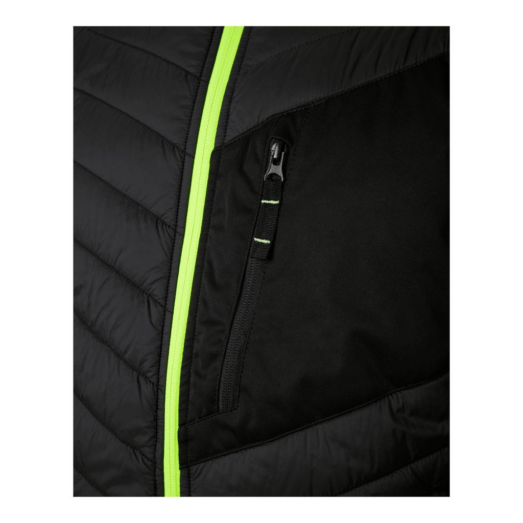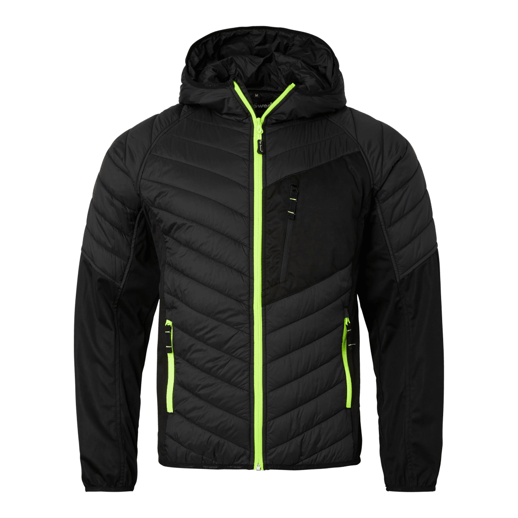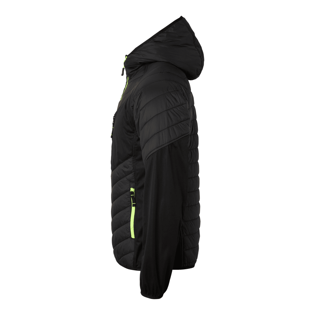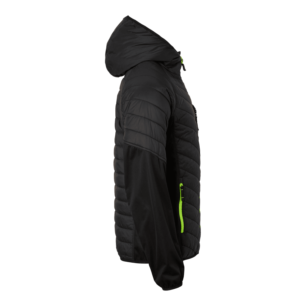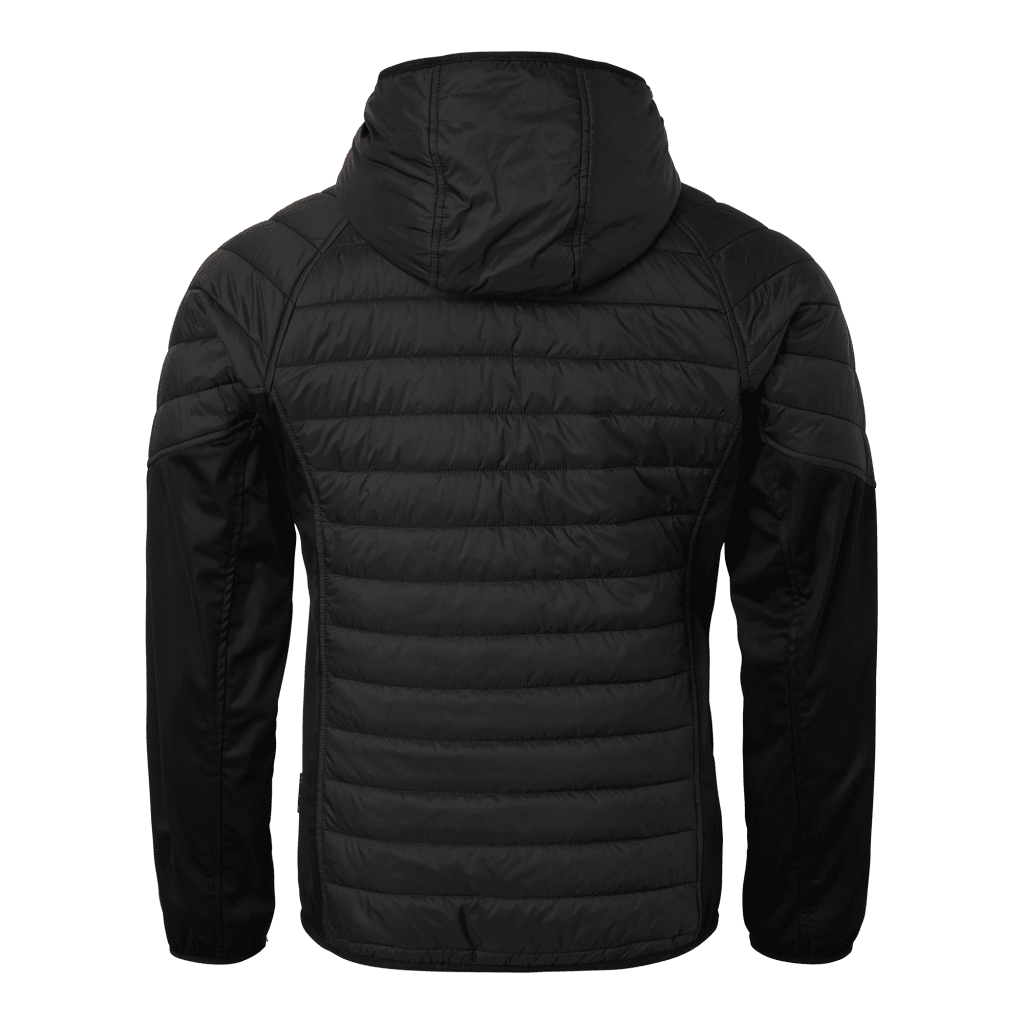 Modern quiltad lättviktsjacka med hood. Dunkänsla med softshellpaneler i stretch på sidan av kroppen, ut under arm, och underarmar. Två främre fickor och en på bröstet med blixtlås. Elastisk mudd i ärmslut och nederkant.